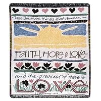 Faith Hope Love Inspirational Woven Tapestry Blanket Throw. 100% cotton 2 1/2 layer throw measures 48"x60". High quality woven blanket throw can be used on the bed, couch, or as a wall hanging. Machine wash cold, tumble dry low. Matching pillow available. Made in the USA.Quote: "There are three things that remain - Faith, Hope & Love - and the greatest of this is Love. 1 Corinthians 13:13"Faith Hope Love throw makes a thoughtful inspiring gift!