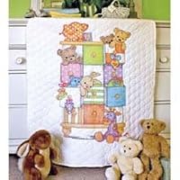 Cuddly toys spilling out of a brightly painted dresser make this stamped cross stitch quilt perfect for a boy or girl. Contains cotton thread, design printed in wash-away ink on prefinished poly/cotton quilt, and needle. Finished Size: 34-inches-by-43-inches