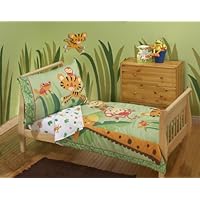 Send your toddler off to a night of dreams filled with swinging from tree to tree in the jungle with a batch of colorful friends when you outfit his or her room with this Fisher Price Rainforest toddler bedding set. It includes a quilt, fitted sheet, flat sheet, and standard-sized pillowcase. The centerpiece quilt features smiling monkeys, a tiger, giraffe, frog and birds with quilted outlines to help them pop off the green rain forest background. The white sheets feature a print of the animals, and the pillowcase echoes the comforter's design. The fitted sheet fits a convertible crib or toddler bed with a standard sized 28 by 52-inch crib mattress. The quilt measures 42 by 57 inches, and the pillowcase measures 20 by 30 inches. All items are made form 55 percent cotton and 45 percent polyester. Machine wash separately in warm water, on the gentle cycle. Use only non-chlorine bleach when needed. Tumble dry on low heat.